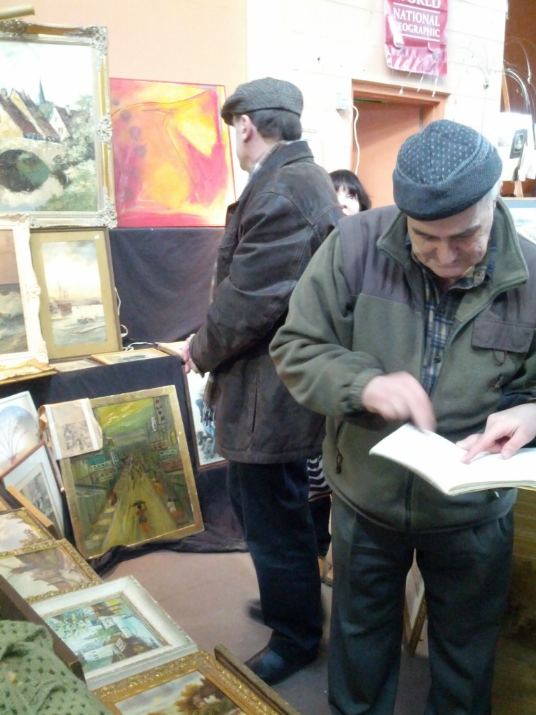 Vendor sharing stories about a painting.