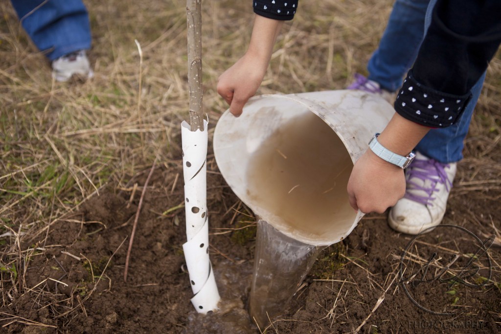 The next step was hilling: basically creating a little moat around the base of the tree to help it retain water. This was my favourite step: I felt like I was building a home for our tree!