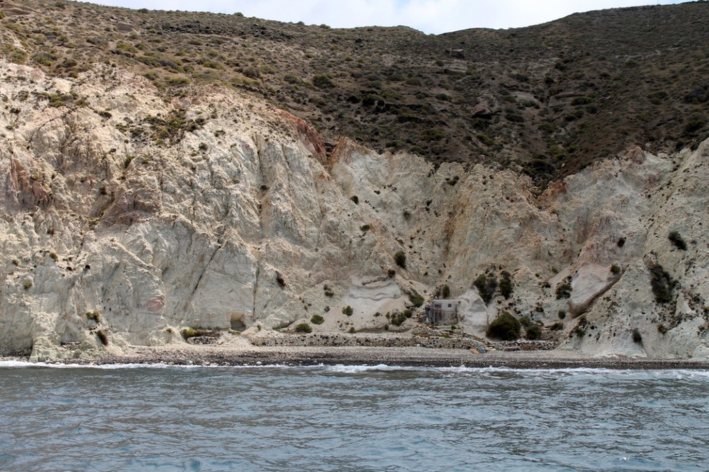 Santorini is known for its colourful beaches so Captain Theo swung by the red and white sand beaches before we headed out to the secluded bay for a swim. Check out the landslide on the red sand beach – glad I wasn’t sunbathing there!