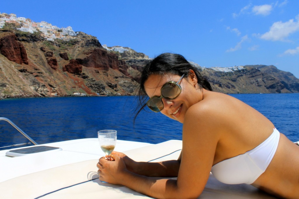 Next we headed towards Oia and stopped at the nearby Ekklesia Agios Nikolaos. Accessible only by boat, it’s one of the many churches dedicated to the patron Saint of sailors. It’s also the cutest little church I’ve ever seen: the perfect backdrop for our feast on board! The food served on Triton is some of the tastiest you’ll have on the island. Freshly prepared by the crew, there’s a delectable spread of local cuisine to devour – from Captain Ted’s famous Shrimp Saganaki and grilled calamari to tzatziki and greek salad…