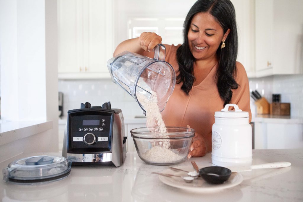 1) Pour rolled oats into your Vitamix and blend until you get a flour consistency.