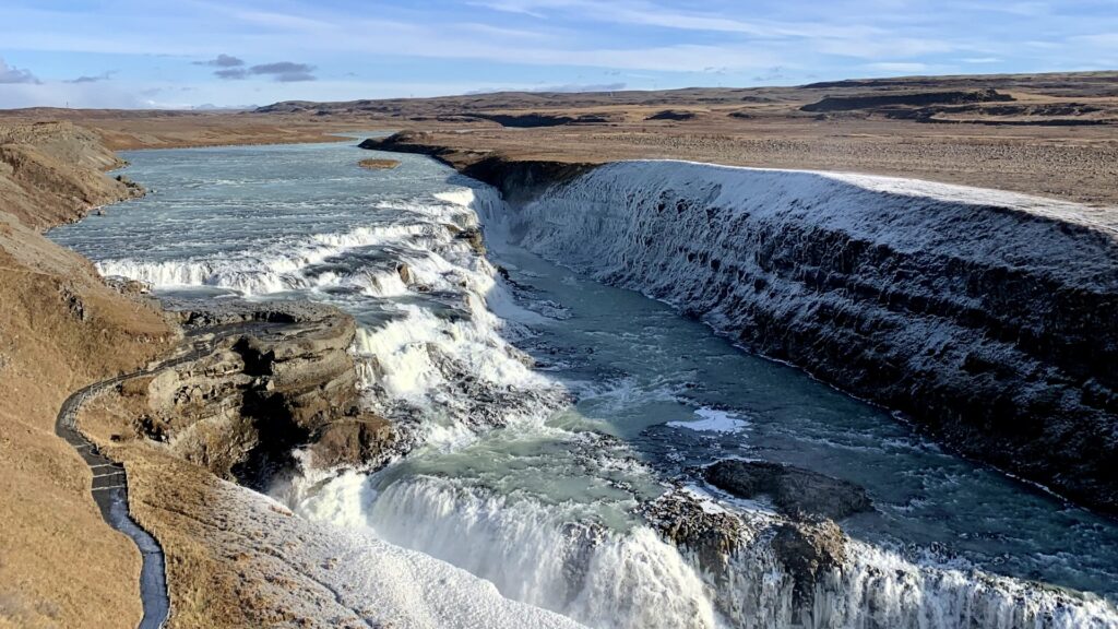 Gullfoss made for an ideal finale. This two-tiered waterfall plunges into a rugged canyon. It’s just a short walk from the parking lot for a quick, misty photo op before heading back to Reykjavík.