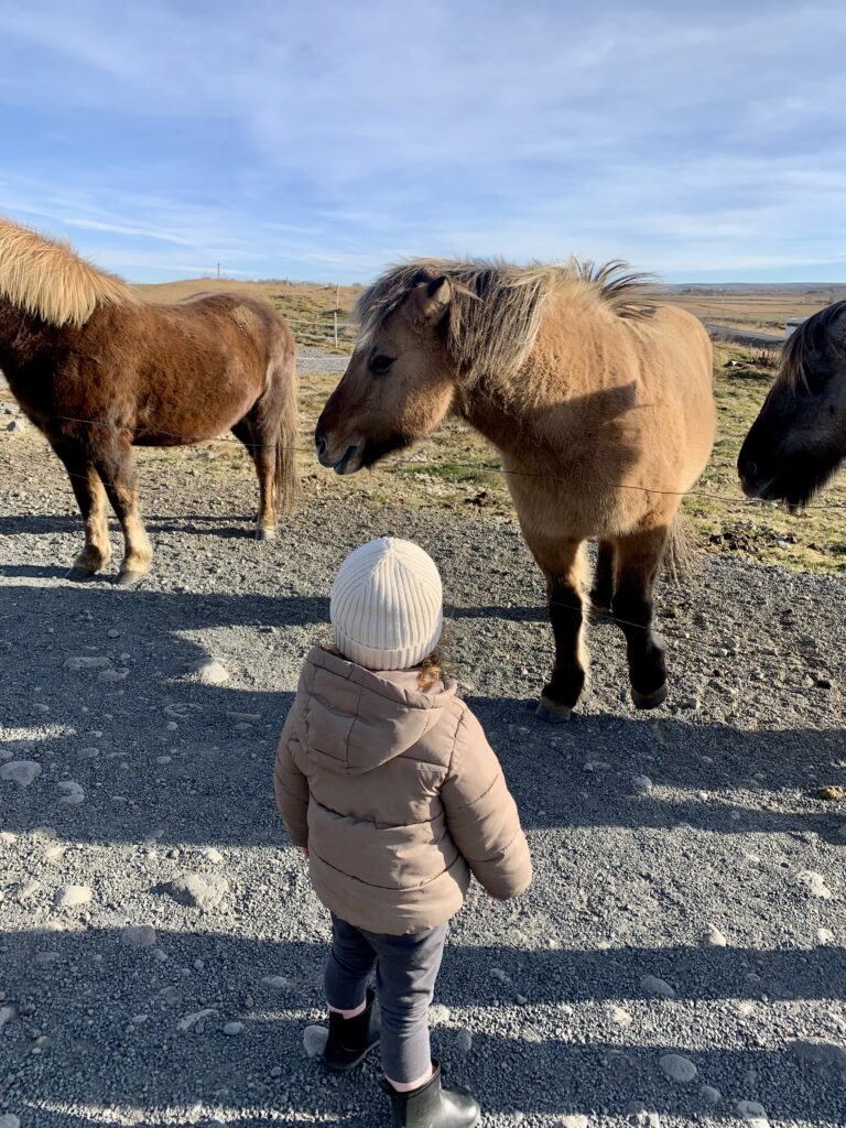 Out on the road, we spotted plenty of Icelandic horses while driving along the Golden Circle, which quickly became a highlight for Izzy. We also made a short detour to Brú Horse Farm, located between Gullfoss and Geysir, where visitors can buy “horse candy” to feed the horses and spend some time up close with them. It’s one of many small farms in the region that welcome visitors — some also offer riding tours, which could be a fun option for families with older kids.