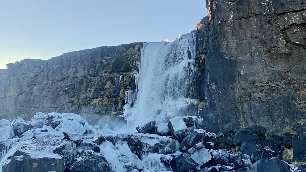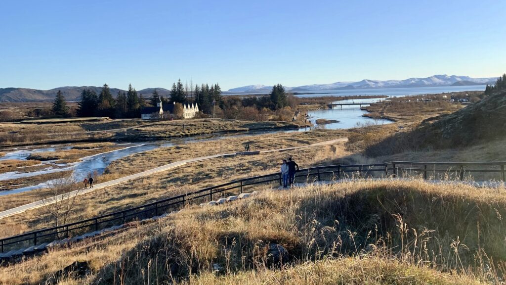 Þingvellir was our favourite stop. The national park is steeped in history and set between two tectonic plates, with easy paths, big views and plenty of space for Izzy to run without us worrying. We followed the trail to Öxarárfoss, a waterfall tucked into the canyon. At about 1.2 km round-trip, it was a satisfying but manageable trek.