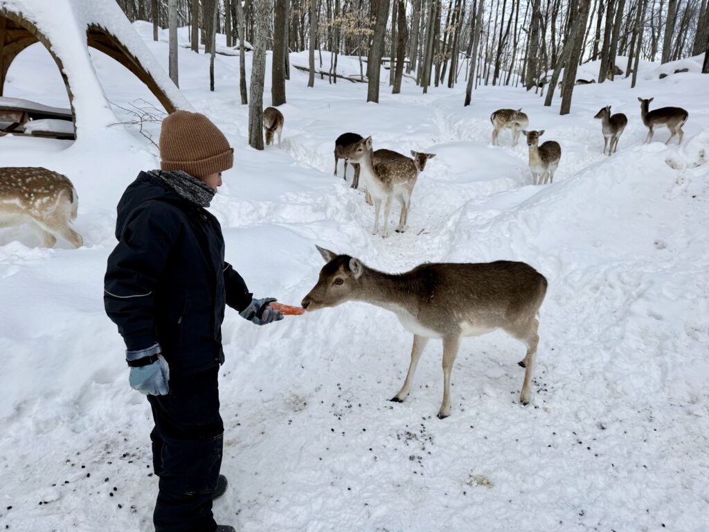 Did you know that Canada has a scenic winter safari?! I did not. The 12 km route at Parc Oméga is such a unique way to immerse yourself in Quebec’s nature. Best part? You can drive through at your own pace, feed some wildlife along the way and you can even get out of your car at designated spots for some close encounters! Our son Luka will NEVER ever forget this experience…
